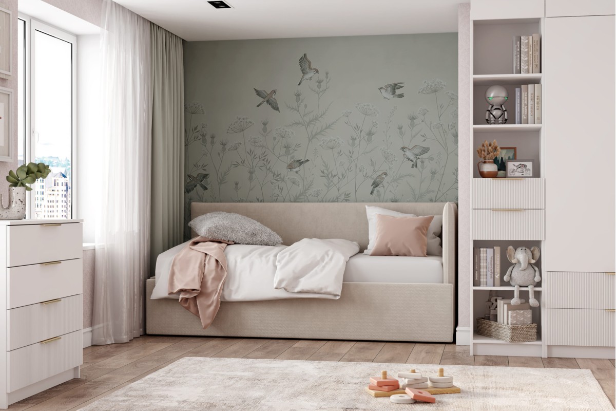 Кровать Бенто 2000×900 Крем отличный выбор для детской: мягкие боковины, приятный кремовый цвет и ткань, которую легко чистить. Удобное спальное место 200×90 см удобно даже подростку, механизм подъёма под нишей для хранения приятный бонус.