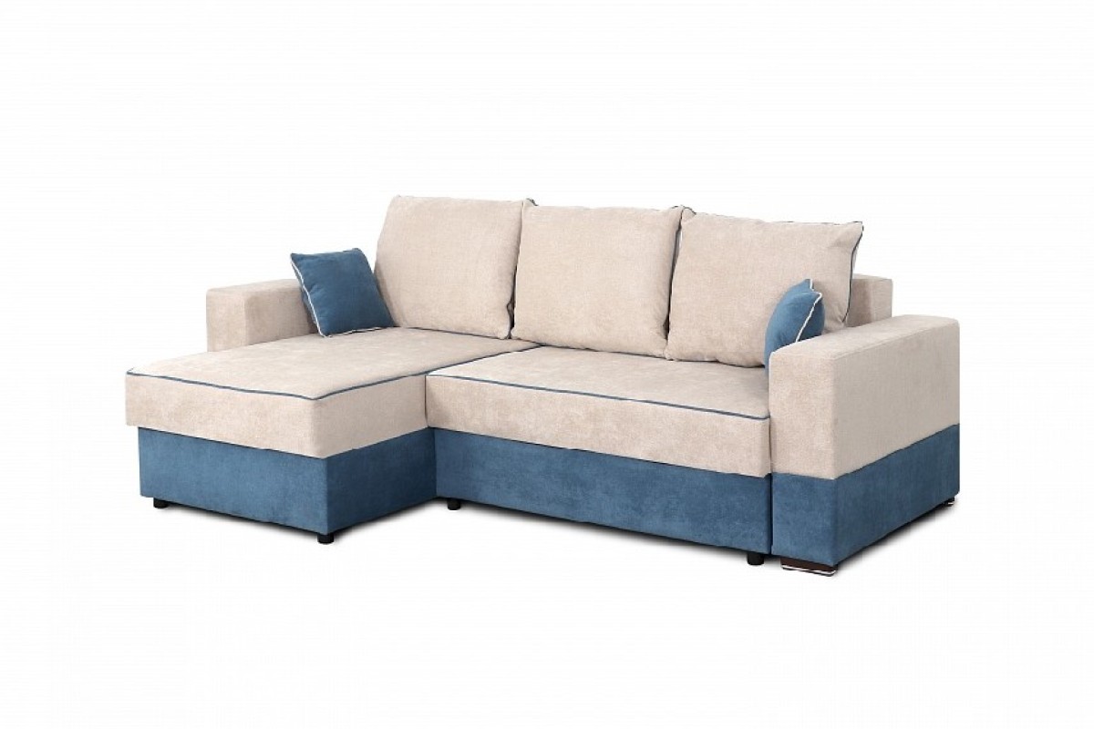 С одной стороны расположена боковина с нишей, с другой – ящики. Надежные петли с доводчиками добавляют комфортности использования мебели. Диван-трансформер может быть прямым, угловым и П-образным. Малые декоративные подушки входят в комплект дивана.