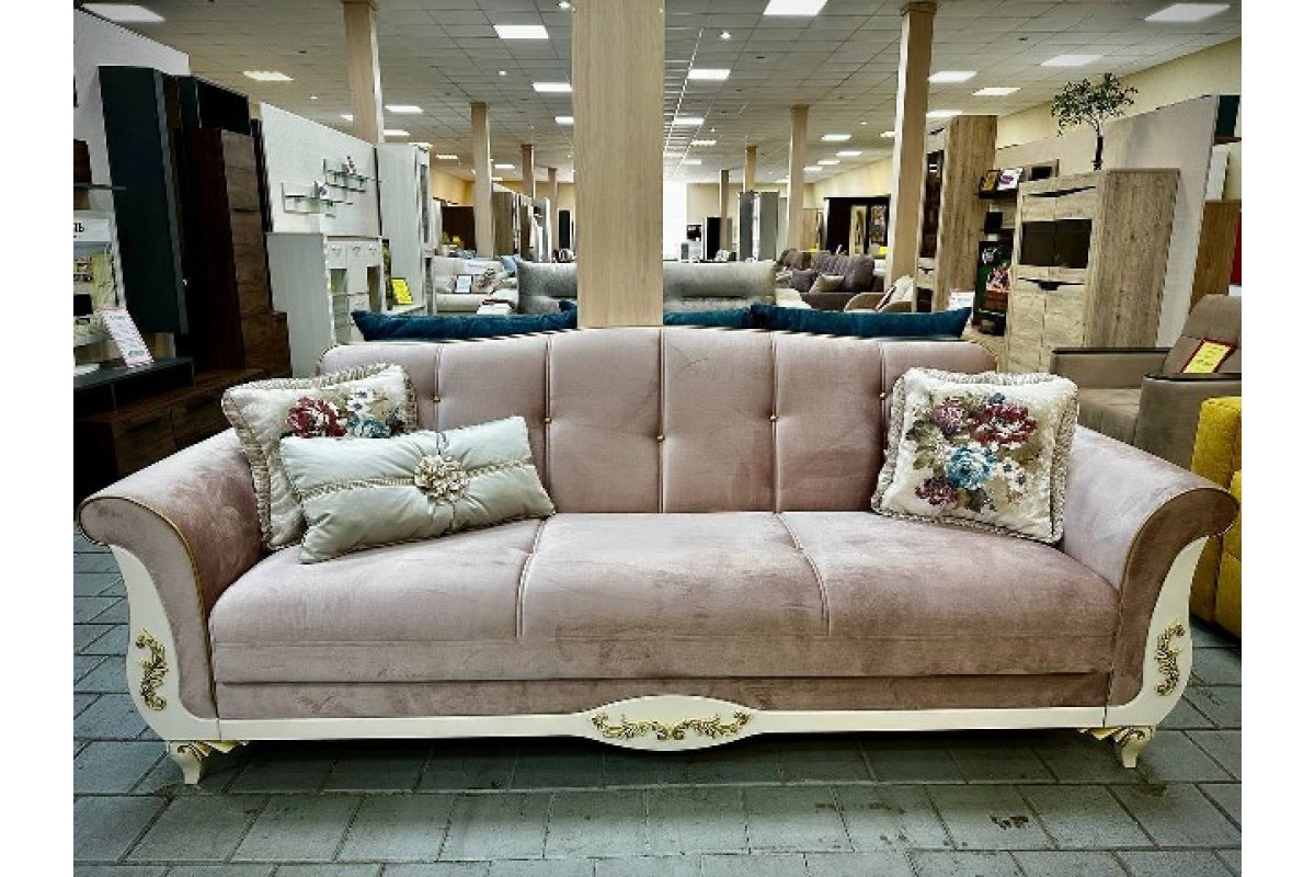Диван "Астория" сочетает в себе яркий дизайн с невероятным удобством. Белые декоративные вставки на лицевой стороне подлокотников украшены узором с золотистым напылением, так же оформлена нижняя часть декора и ножки. Золотистый кант лишь дополняет образ роскошного изделия. Этот трехместный диван подойдет ценителям прекрасного и станет отличным дополнением к коллекции "Астория".